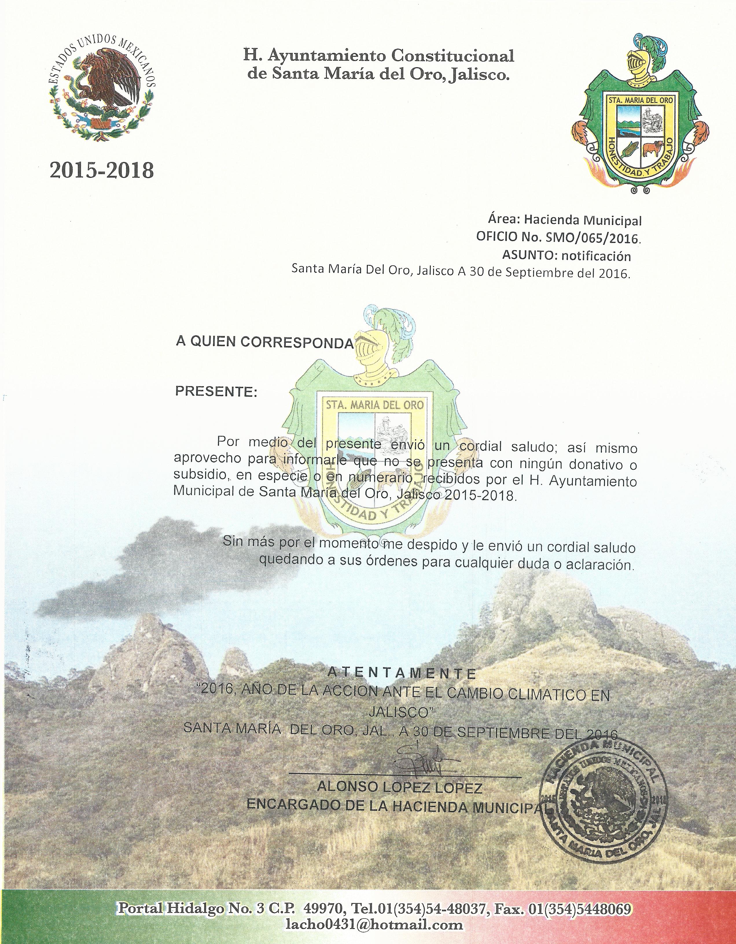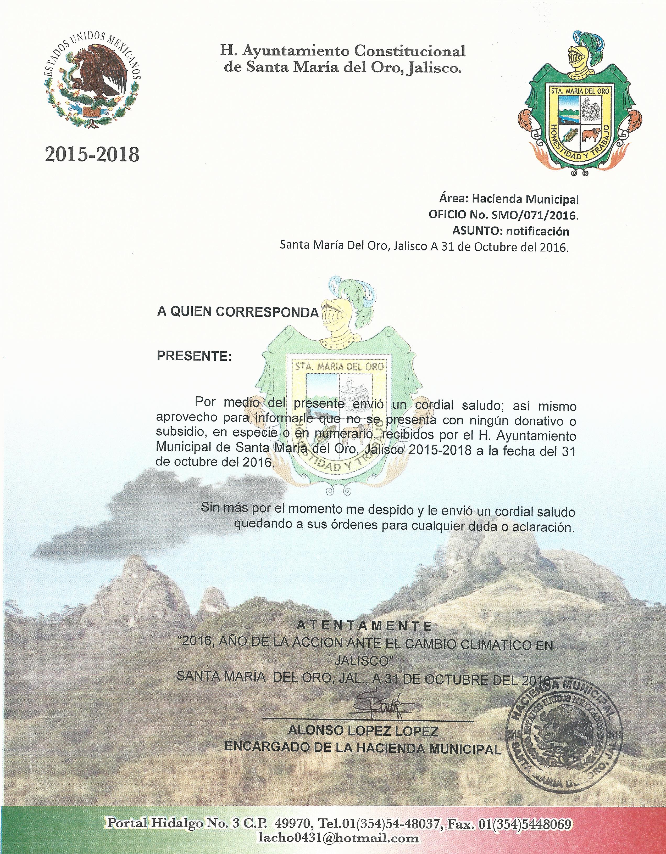 OFICIO DE INEXISTENCIA DE DONATIVOS O SUBCIDIOS RECIBIDOS JULIO 2016